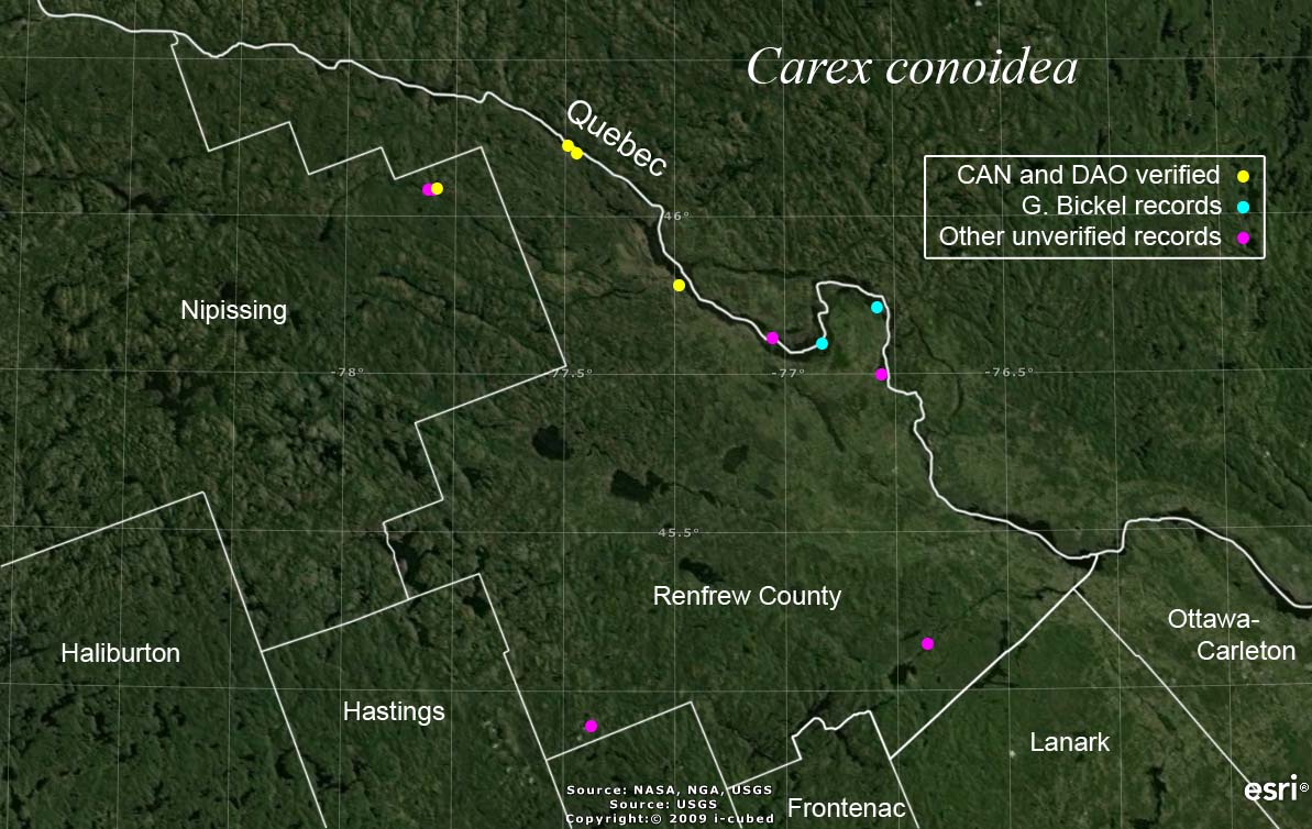 Carex conoidea is sparse in Renfrew County. It is frequent along the Ottawa River within the seasonal floodplain.