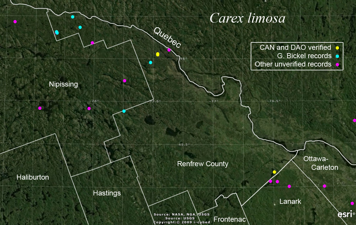 Carex limosa is sparse in Renfrew County. It is a species of bogs and fens adjacent to open water, mat-forming with roots immersed in the water.
