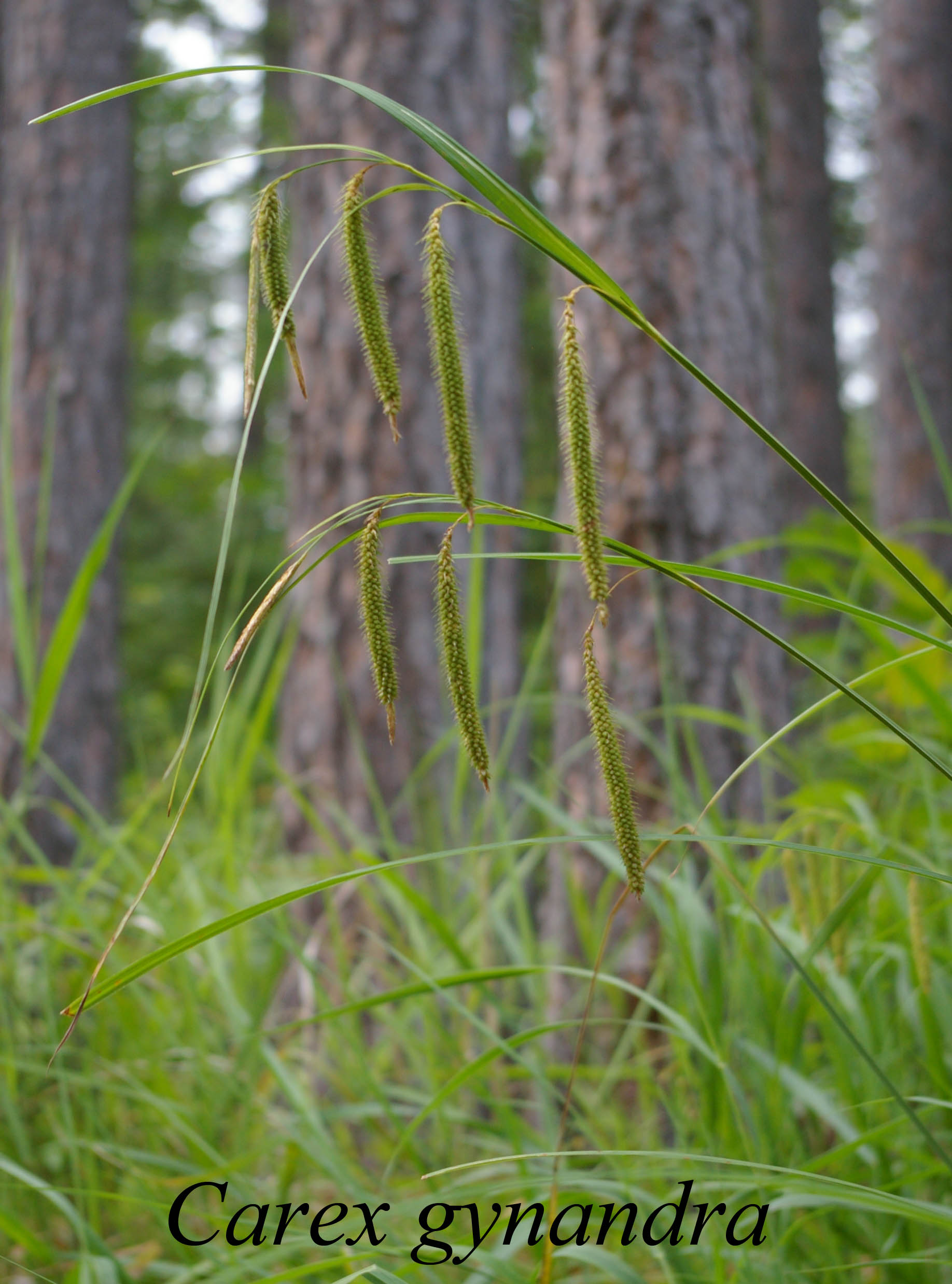 Carex gynandra is common in Renfrew County preferring the sandy soils in the northwestern portion of the county. Carex gynandra is superficially identical to Carex crinita; the long pendulous pistillate spikes are distinctive to both. The identity of Carex gynandra can be confirmed by feeling its scabrous lower sheaths.