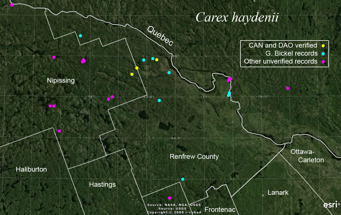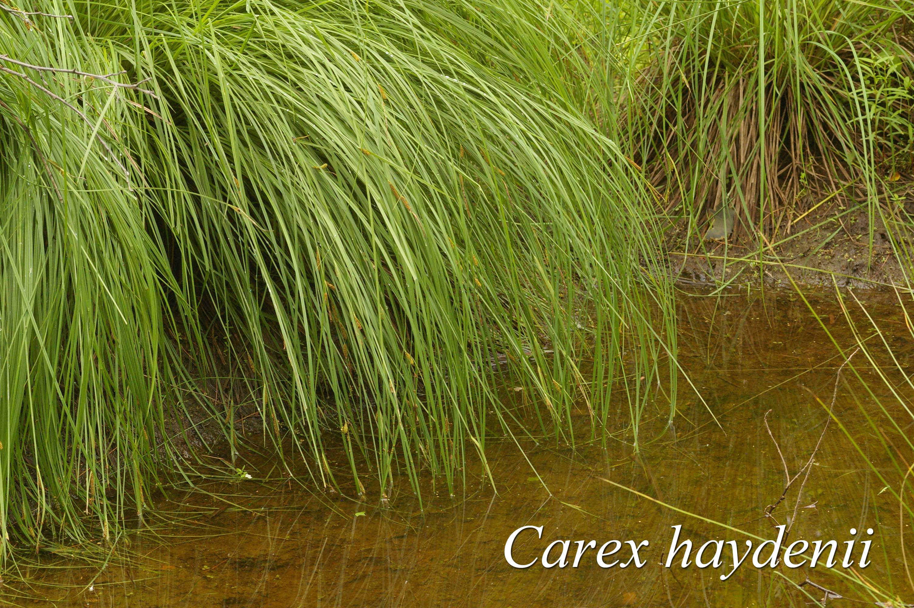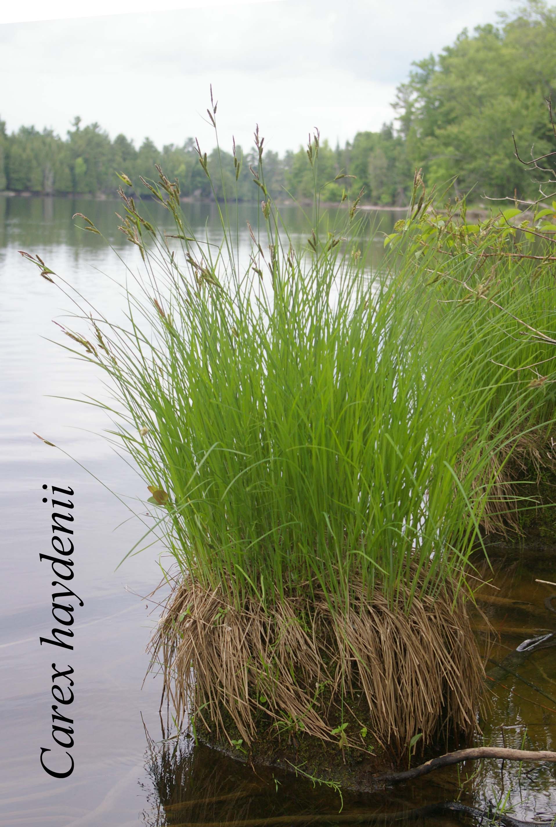 Carex haydenii is sparse and apparently more frequent in the northwestern portion of Renfrew County. It grows in beaver ponds and slow moving creeks and rivers. Carex haydenii forms large tussocks that are superficially indistinguishable from Carex stricta. The inflorescence is required to confidently separate Carex haydenii from Carex stricta.