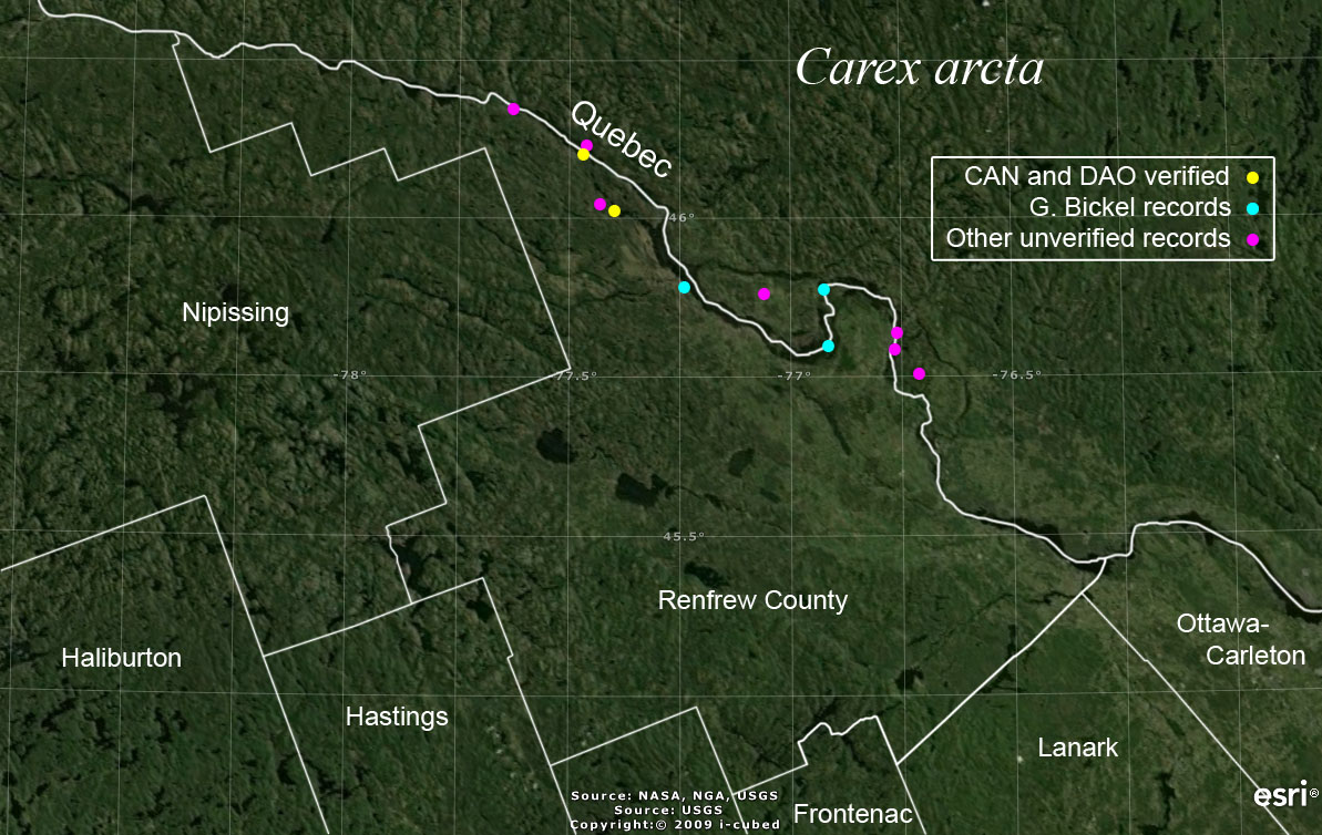 Carex arcta is sparse in Renfrew County. It is different from the other species of Section Glareosae by its crowded and overlapping spikelets and a more evident serrate beak on the peryginia. Likewise, it is found in dryer, but seasonally flooded, woodland habitats; e.g., back-beaches along the Ottawa River.