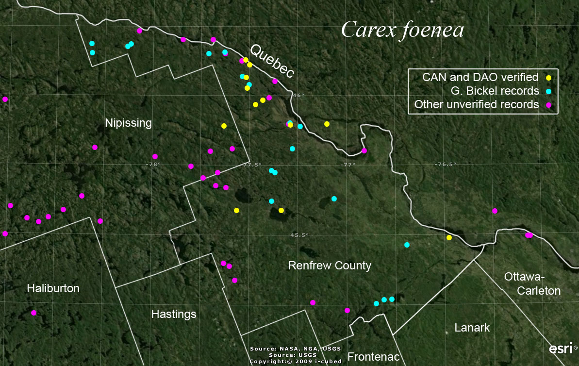 Carex foenea is common in the acidic soils in the northwestern portion of Renfrew County. It is quite distinctive from the other common Section OVALES species with its scales nearly covering the perigynia. Older records of C. foenea are usually labelled as C. aenea and the name C. foenea has also been applied recently to C. siccata so tracking and verifying C. foenea records requires some care. Furthermore, C. foenea has frequently been confused with C. argyrantha but the perigynia of C. argyrantha are smaller with prominent veins on both faces and prominent wings with serrulate edges when compared to C. foenea